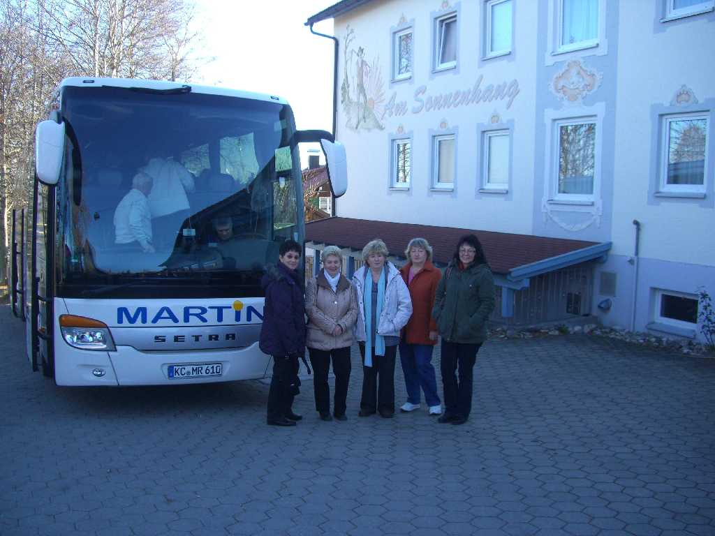 Die 35. Busfahrt des Gänsemarktvereins führte uns als Advendsfahrt vom 25. - 27.11.11 nach Oy Mittelberg in das Hotel „Am Sonnenhang“. Schon am Empfang wurden wir mit unserem Logo Willkommen geheißen. Bei Superwetter hatten wir einen schönen Blick zur Zugspitze. Anlässlich der Jubiläumsreise wurde auf der Anfahrt ein Quiz durchgeführt. Die Preise (von Martin-Reisen, unserem Busfahrer Wolf-Dieter und dem Gänsemarktverein) wurden am Abend während einer kleinen Feier mit zwei sehr guten Musikern bei Superstimmung verteilt. Als Sieger gingen Klaus Henkel vor Hannelore Henkel und Brigitte Hedwig hervor. Nachdem wir schon auf der Anfahrt in Ulm den 1. Weihnachtsmarkt besucht hatten, durchstreifenden wir am Samstag Abend in Bad Hindelang den Weihnachtsmarkt und erlebten den Weihnachtsumzug. Auf der Rückreise konnten wir in Rothenburg ob der Tauber den 3. Weihnachtsmarkt erkunden. Am Samstagvormittag besichtigten die meisten Teilnehmer das Königsschloss Neuschwanstein, während der Rest die Stadt Füssen besuchte. Nach der Heimreise fanden sich noch einige Teilnehmer in der Schlemmerstube am Gänsemarkt zum Abendessen ein. An dieser Stelle noch ein herzliches Dankeschön für den selbstgebackenen Kuchen an Ellen, Doris, Heidrun und Christine, an unseren Busfahrer Wolf-Dieter für den Sekt sowie an die Sponsoren der Preise für das Quiz.