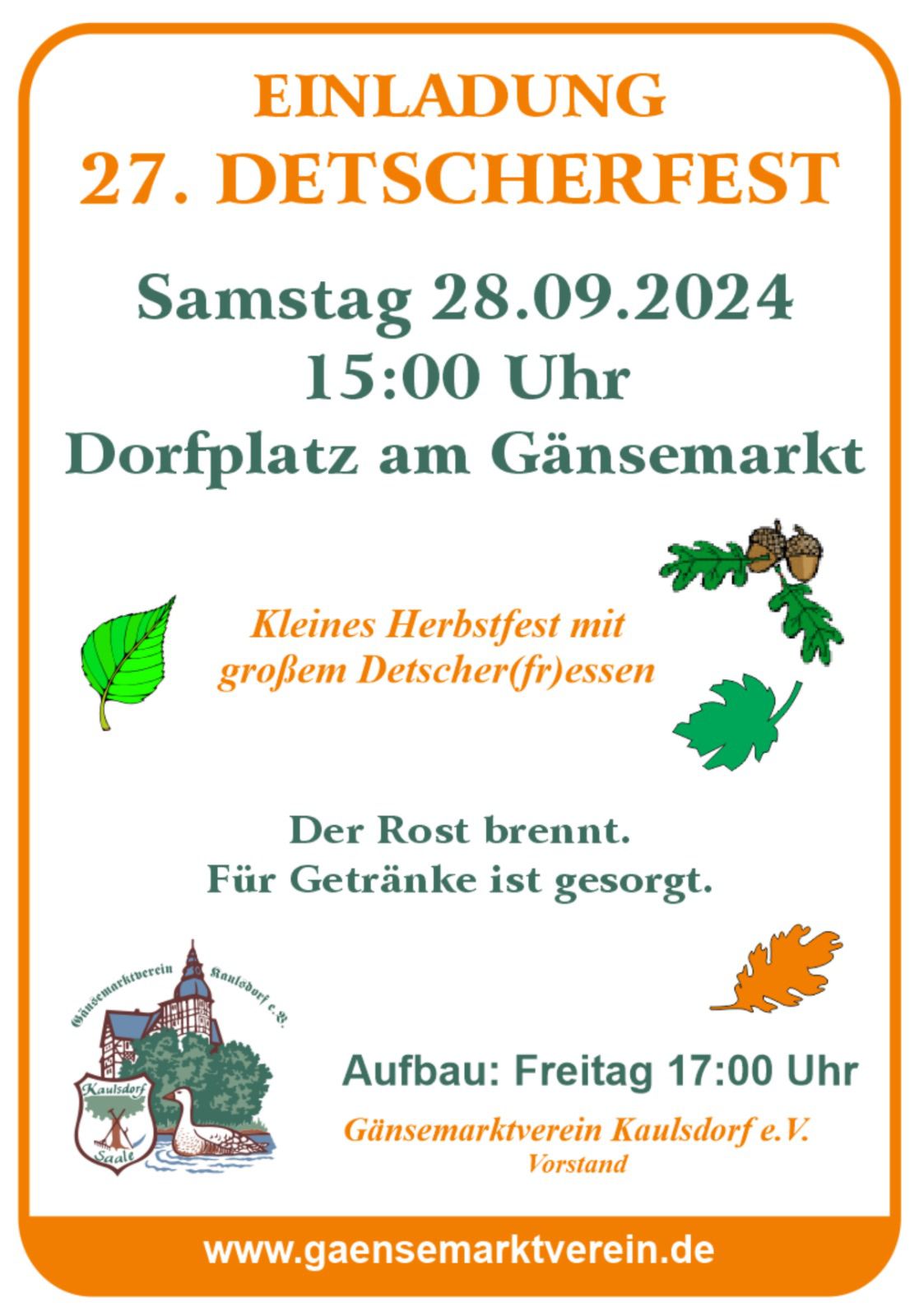 Manche Veranstaltungen sind eine einmalige Sache oder verschwinden im Laufe der Zeit wieder aus den Kalendern. Das Detscherfest wird in Kaulsdorf bereits zum 27. Mal gefeiert. Die Beliebtheit des einstigen Arme-Leute-Essen ist nicht zu leugnen. Dabei ist das Fest von der Größe eher bescheiden. Bis 2022 fand das Fest noch im Hof der Familie Eckert statt und so haben sich selten fremde Leute hierher verirrt. Erst im letzten Jahr, nachdem der Dorfplatz am Gänsemarkt eingeweiht wurde, wurde auch das Fest auf den Dorfplatz verlegt und lockte mehr Passanten an. Zwei Zelte waren schnell aufgestellt und auch die Hüpfburg fand einen Platz, doch nach wie vor wird hier Gemütlichkeit groß geschrieben.