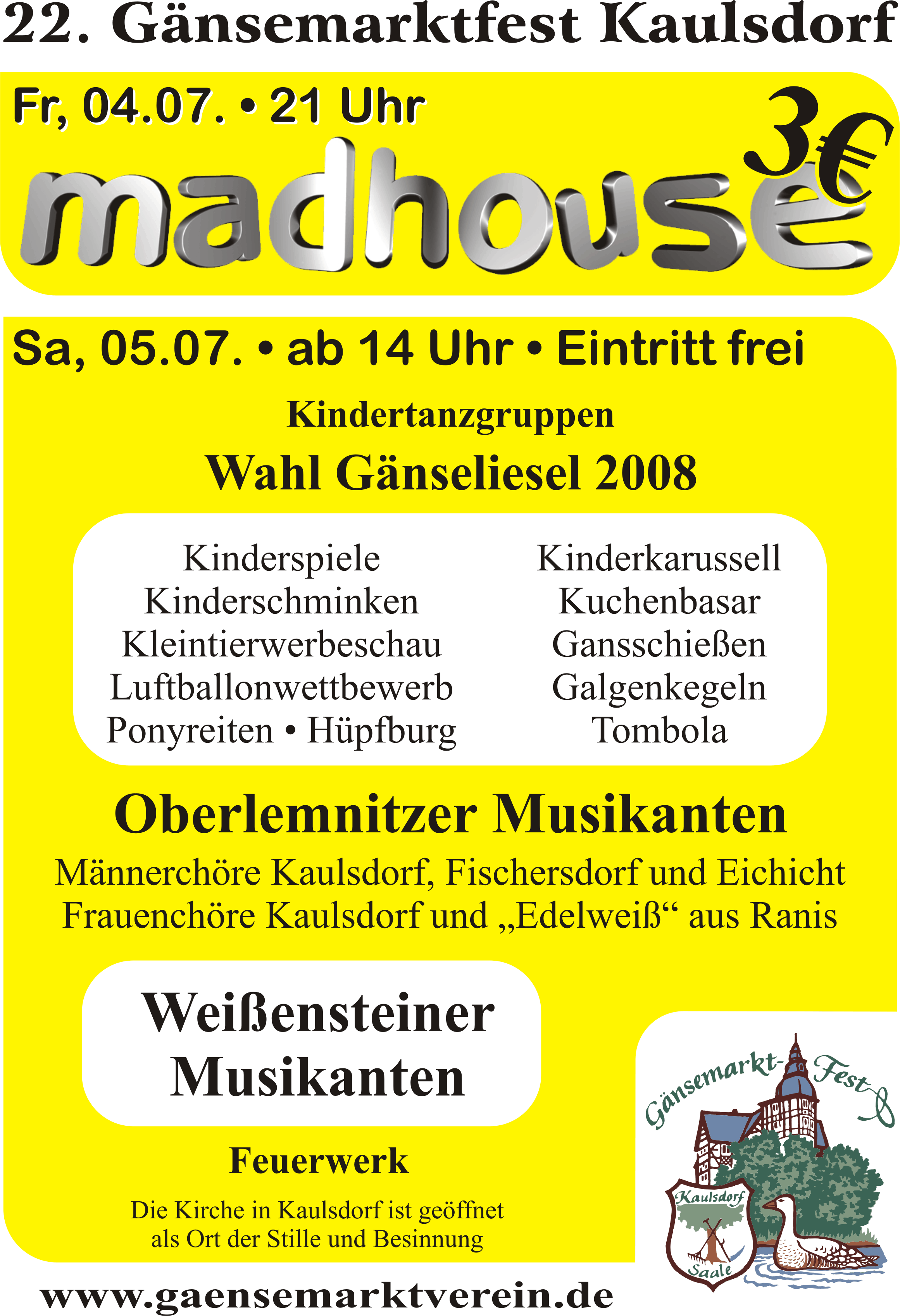 Das Gänsemarktfest in Kaulsdorf zählt seit Jahren zu den beliebtesten Festen der Region. Dies bestätigte im vergangenen Jahr auch eine Umfrage der OTZ. Am 04.07.08 ist es wieder soweit: Das Gänsemarktfest gibt seinen Auftakt in bewährter Tradition. Für nur 3 € Eintritt gibts Live Musik vom Feinsten. In diesem Jahr geben sich „Madhouse” die Ehre und sorgen für Partystimmung.Auch der Samstag steckt voller Traditionen. Ab 14 Uhr gibts wieder Kaffee und selbstgebackenen Kuchen von den Frauen des Gänsemarktvereins. Ein Programm für die ganze Familie bringt gute Laune für Jung und Alt. Der Eintritt ist den ganzen Tag frei. Schon am frühen Nachmittag präsentieren sich die Kindertanzgruppen von Kaulsdorf. Somit bleibt danach genügend Zeit, um sich auf der Hüpfburg auszutoben oder beim Kinderschminken in andere Rollen zu schlüpfen. Natürlich sind auch wieder das Glücksrad und der Luftballonwettbewerb dabei. Und während die einen mit Ponys ausreiten, können die anderen beim Galgenkegeln und Gansschießen mächtig abräumen. Denn hier wartet als erster Preis jeweils eine Gans. Um das Siegertreppchen zu füllen bekommen die zweiten und dritten Plätze eine Ente bzw. einen Hasen. In der Tombola warten weitere attraktive Preise.