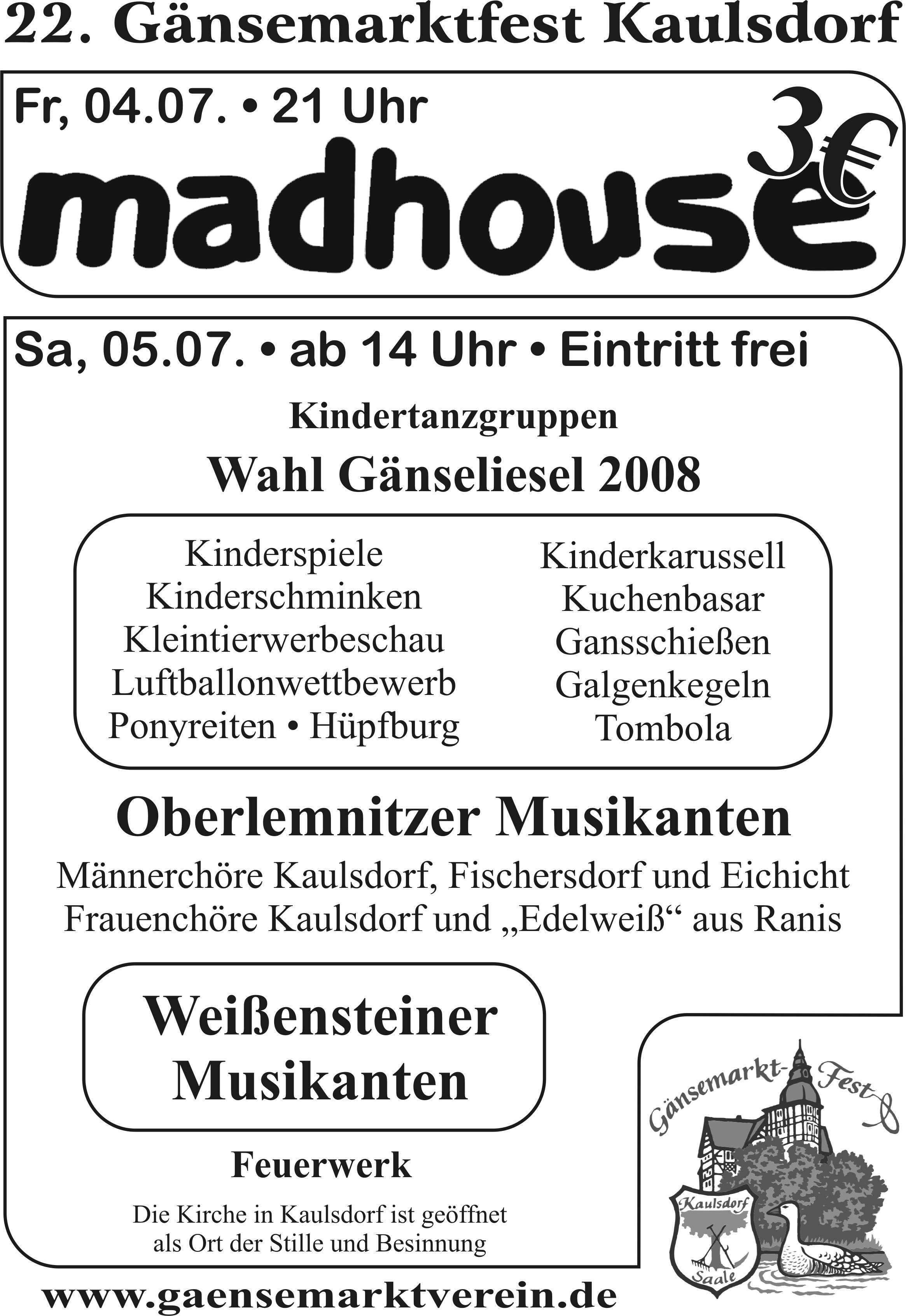 Nachdem es sich nach dem Aufbau der Bühne abgeregnet hatte, konnte das 22. Gänsemarktfest bei schönem Wetter am Freitag, dem 04.07.08 mit dem Open-Air mit „Madhouse“ starten. Ca. 1000 Gäste kamen trotz großer Konkurrenz in der Umgebung auf den Gänsemarkt. Am Samstag eröffnete der Hort der Kaulsdorfer Schule mit einem einstudierten Programm. Der Höhepunkt des Auftrittes war dann die Wahl des Gänseliesel 2008. Nach dem Wettbewerb setzte sich in einem Stechen Michelle Messerosch durch und wurde das erste Gänseliesel. Sie war dann am Abend auch gleich die Glücksfee der Tombola. Das Programm wurde mit den Kindern des Kindergarten Kaulsdorf fortgesetzt. Für die gelernten Tänze und Lieder gab es reichlich Beifall und für alle Kinder ein verdientes Eis. Ein Kinderkarussell, Ponyreiten, Hüpfburg, Glücksrad, Kinderschminken und ein Luftballonwettbewerb boten den Kindern Unterhaltung. Auch die Kleintierwerbeschau fand große Beachtung. Vor allem das ältere Publikum war von den Oberlemnitzer Musikanten begeistert. In der Pause traten die Frauenchöre aus Kaulsdorf und Ranis sowie die Männerchöre aus Kaulsdorf und Fischersdorf auf. Mit den Weißensteiner Musikanten und einem beeindruckenden Feuerwerk klang ein gelungenes Fest aus.