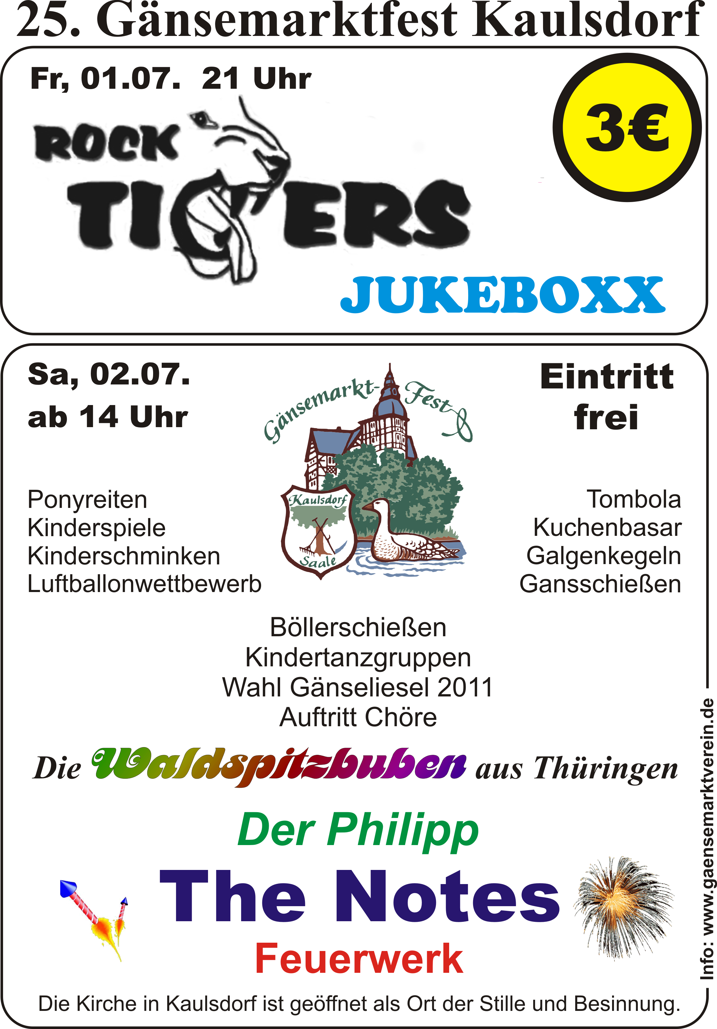 25 Jahre... Ist die Zeit wirklich so schnell vergangen? In der Tat, hat sich seit dem 1. Gänsemarktfest so manches verändert. Aber wir wollen nicht abschweifen. Wer sich für die Geschichte des Vereins interessiert, sollte sich die Festschrift genauer anschauen, die anlässlich dieses Jubiläums erschienen ist.Am Freitag, den 01.07.2011 ist es wieder soweit. Dann begrüßen wir erneut die Rock Tigers auf unserer Bühne, die mit ihrer Show ein Garant für Gute Laune sind. Anlässlich unseres Jubiläums bringen die Tigers diesmal sogar Verstärkung mit: Jukeboxx, eine noch junge Band, die mit Spannung erwartet werden darf. Nicht nur Freunde von Beständigkeit werden sich über den Eintrittspreis freuen. Diesen konnten wir auch in diesem Jahr bei 3,- € belassen.