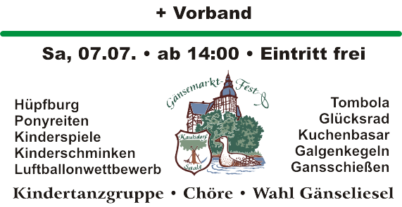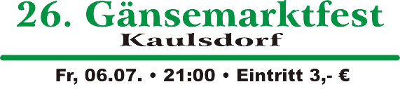 Am ersten Juli-Wochenende ist die Straße am Gänsemarkt in Kaulsdorf gesperrt. Grund für die Sperrung ist das weitläufig bekannte Dorffest, zu welchem der Gänsemarktverein alljährlich einlädt. Denjenigen, die eine gute Ausrede haben, nicht an den Feierlichkeiten teilzunehmen sei gesagt, dass sich die Umleitung kaum auf die Fahrzeit auswirkt. Alle anderen sind herzlich willkommen.Los geht's am Freitag, dem 06.07, mit dem Open-Air. Auch in diesem Jahr sind Sie für nur 3 € Eintritt dabei. Erstmalig lassen es Swagger auf dem Gänsemarkt krachen. Zusätzlich bekommen junge Talente die Gelegenheit, ihre Kunst zum Besten zu geben. Wer die Vorband nicht verpassen will, sollte sich frühzeitig auf den Weg machen.