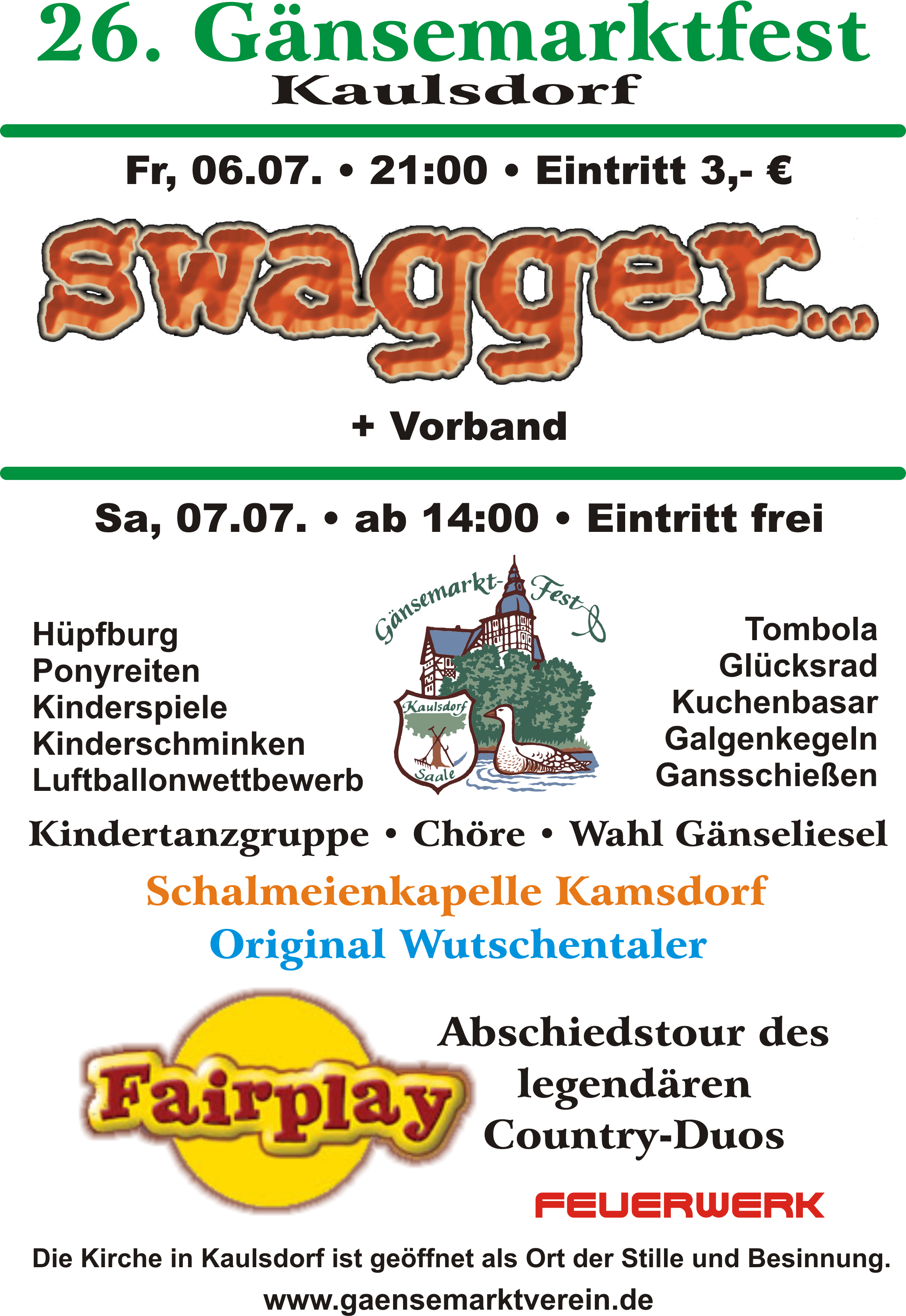 Der Samstag bietet ein vielseitiges Programm für die ganze Familie. Den Auftakt gibt die Kindertanzgruppe bereits ab 14 Uhr gefolgt von der Wahl zum Gänseliesel und den Chören der Region. Dank Hüpfburg, Ponyreiten, Kinderspielen, Luftballonwettbewerb, Kinderschminken und Galgenkegeln sollte die Zeit für die Kinder wie im Flug vergehen. Für größere Kinder steht auch wieder das Gansschießen bereit. Schließlich gehört es wie auch der Kuchenbasar oder die Tombola längst zur Tradition des Gänsemarktfestes. Während am Nachmittag die Schalmeienkapelle Kamsdorf und die Original Wutschentaler für Stimmung sorgen, gibt sich am Abend das Country-Duo Fairplay die Ehre. Wir freuen uns die beiden sympathischen Musiker noch einmal begrüßen zu dürfen, bevor sie nach 20 Jahren ihren Hut ziehen wollen. Das Feuerwerk scheint auch in diesem Zusammenhang passend. Der Eintritt ist übrigens den ganzen Tag frei.