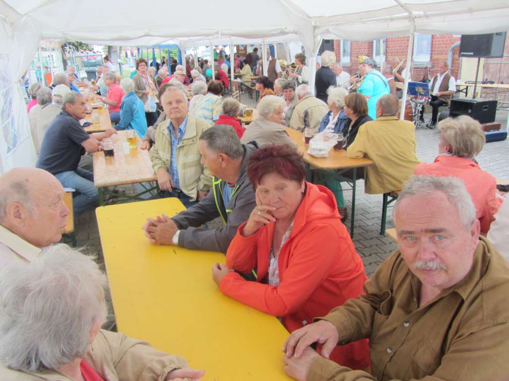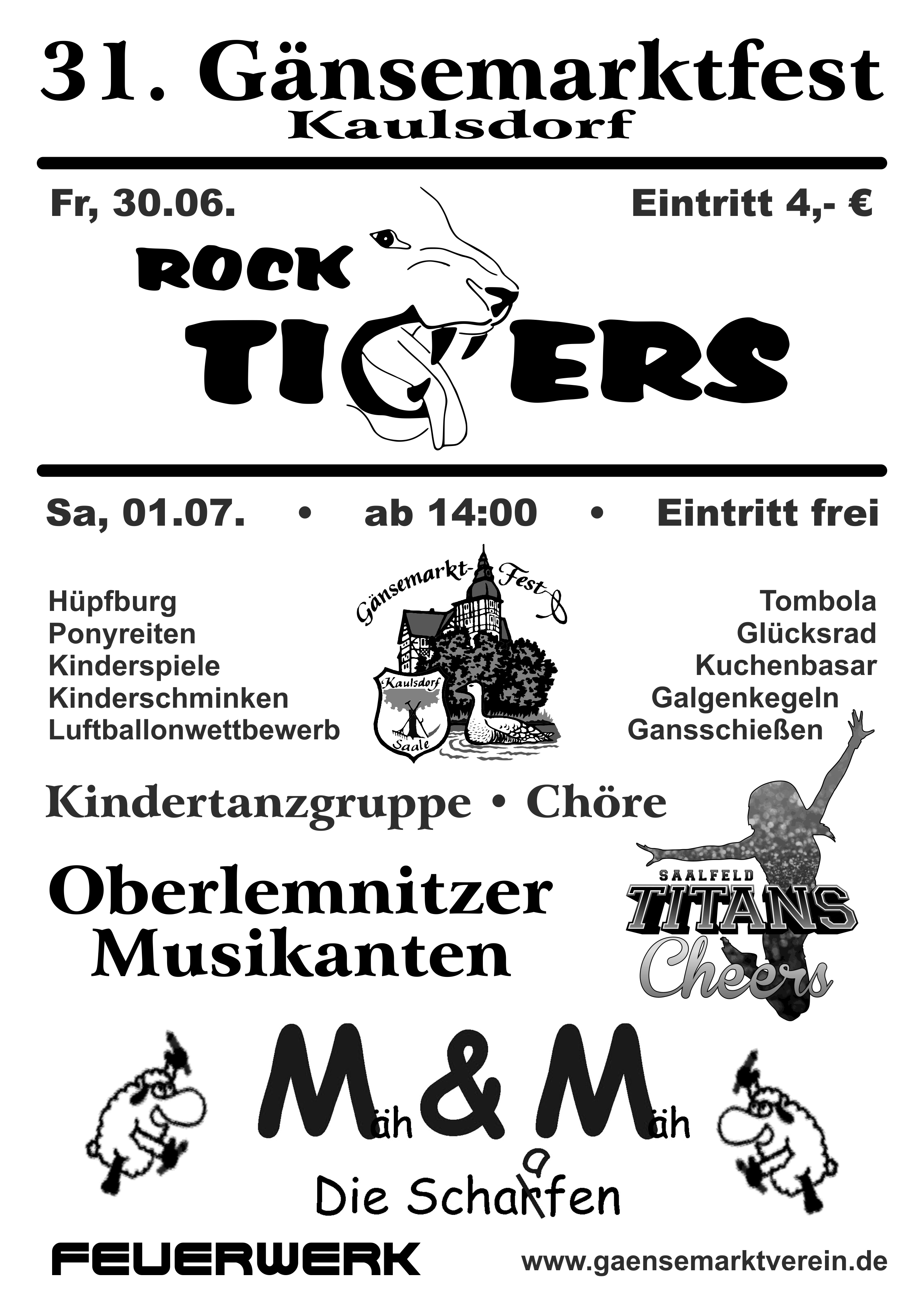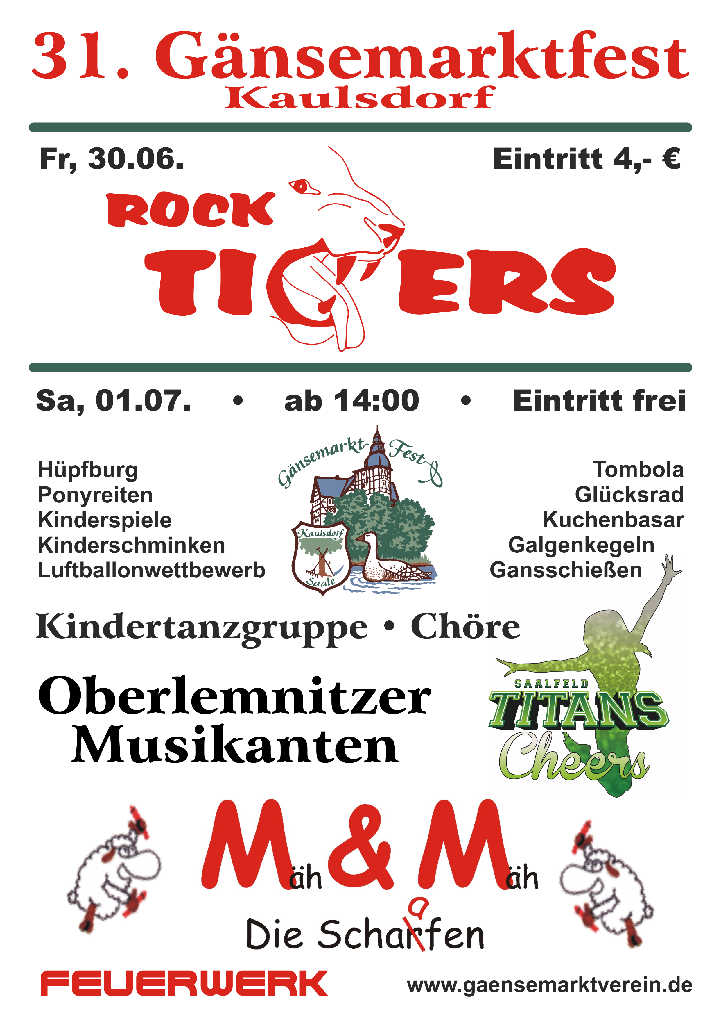Nun war es wieder soweit. Am 30. Juni begann das 31. Gänsemarktfest. Bereits am Montag zuvor konnte man ein emsiges Treiben sehen. Vereinsmitglieder waren damit beschäftigt Zelten aufzubauen und die letzten Vorbereitungen zu treffen, damit am Freitag alles reibungslos beginnen konnte. Das Open-Air mit den Rock Tigers eröffnete am Abend das Fest und begeisterte dabei nicht nur die Jugend. Über 700 Gäste aus Nah und Fern feierten und tanzten bei recht gutem Wetter bis in die frühen Morgenstunden. Am Samstag bot dann ein abwechslungsreiches Programm für Alle. Bei selbst gebackenen Kuchen und Kaffee hörte man den Klängen der Oberlemnitzer Musikanten sehr gern zu. Der Kindergarten Sonnenblume freute sich auf seinen Auftritt und auch der gemeinsame Auftritt der Männerchore aus Kaulsdorf und Fischerdorf bereicherte das Fest. Am späteren Nachmittag feierten die Saalfeld Titans Cheers ihr Debüt auf dem Gänsemarkt. Mit ihrer artistischen Darbietung hatten die jungen Mädels schnell die komplette Aufmerksamkeit auf sich gezogen. Allen hat es sehr gut gefallen, war es doch optisch ein richtiger Hingucker. Beim weiteren Rahmenprogramm war in diesem Jahr vor allem das Ponyreiten wieder sehr beliebt. Aufgrund der großen Nachfrage drehten die Ponys noch ein paar extra Runden. Aber auch beim Glücksrad, Kinderschminken, Luftballonwettbewerb, Hüpfburg, Galgenkegeln, Tombola und Gansschießen verging die Zeit wie im Fluge. Die Verpflegung übernahmen der Partyservice Krauße und die Schlemmerstube, die Eis und leckere Fischbrötchen am Fenster servierte. Am Abend wurde es mit dem Duo M&M alias "Mäh & Mäh - die Schaafen" noch einmal richtig gemütlich. Die Jungs hatten bei dem Regen keinen einfachen Job. Doch nach und nach füllte sich die Tanzfläche und die Stimmung war einfach super, sodass die Band noch eine Extra-Runde spielte. Natürlich gab es auch wieder ein Feuerwerk, dass sich auch Dank der Kulisse zwischen Kaulsdorfer Schloss und Kirche nicht hinter den Feuerwerken größerer Veranstaltungen zu verstecken braucht. Es war wieder ein gelungenes Fest. Ein großer Dank an Alle, die dazu beigetragen haben. E.W.31. Gänsemarktfest in Kaulsdorf