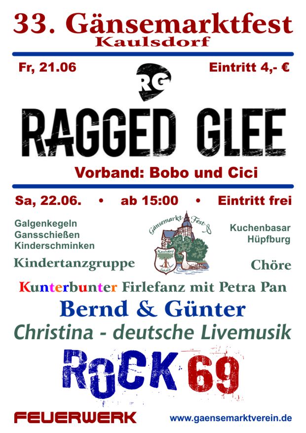 Das 33. Gänsemarktfest ist Geschichte. Wie gewohnt startete das Fest am Freitag mit einem Open-Air, dass sich vor allem an die Jugend und alle Junggebliebenen richtet. Mit besonders günstigen Eintrittspreisen und der richtigen Band soll hier für Feierlaune gesorgt werden. Und es funktioniert: Obwohl die Band in unserer Gegend noch recht unbekannt ist, ist es Ragged Glee gelungen, das Publikum mitzureißen. Die Band aus Jena weiß sowohl mit Qualität als auch Vielfalt zu überzeugen.