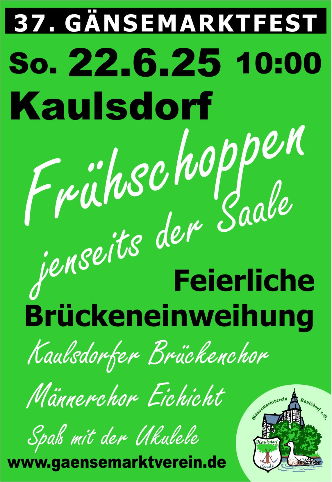 Auch unsere neue Brücke, die westlich des Gänsemarkts an der Mündung des Wutschenbachs über die Saale führt, verdient eine feierliche Einweihung. Und so gibt es am Samstag Abend ein Feuerwerk über der Brücke und am Sonntag ab 10:00 einen Frühschoppen jenseits der Saale. Zur feierlichen Unterhaltung tragen der "Kaulsdorfer Brückenchor", der "Männergesangverein Eintracht 1888 Eichicht" und "Spaß mit der Ukulele" bei.