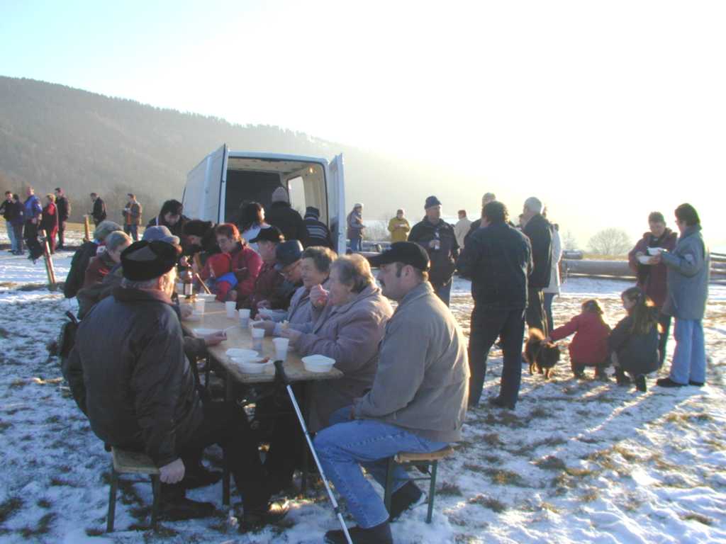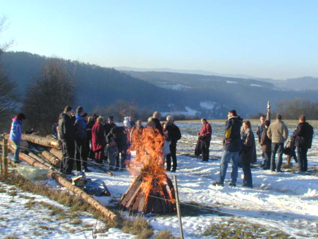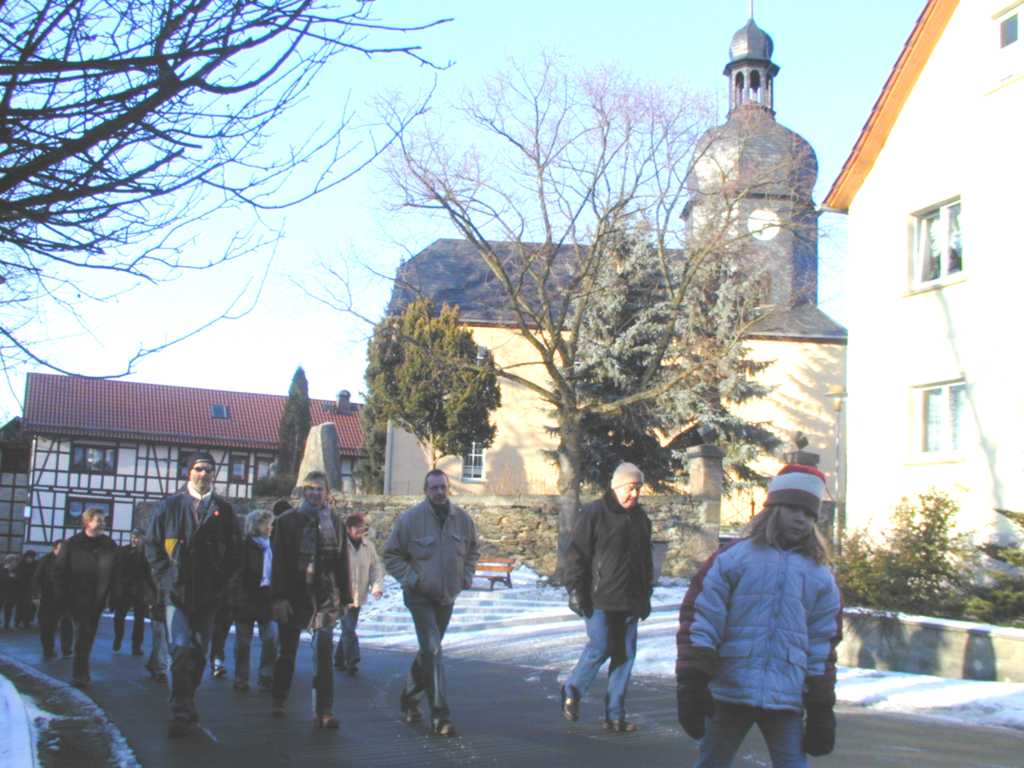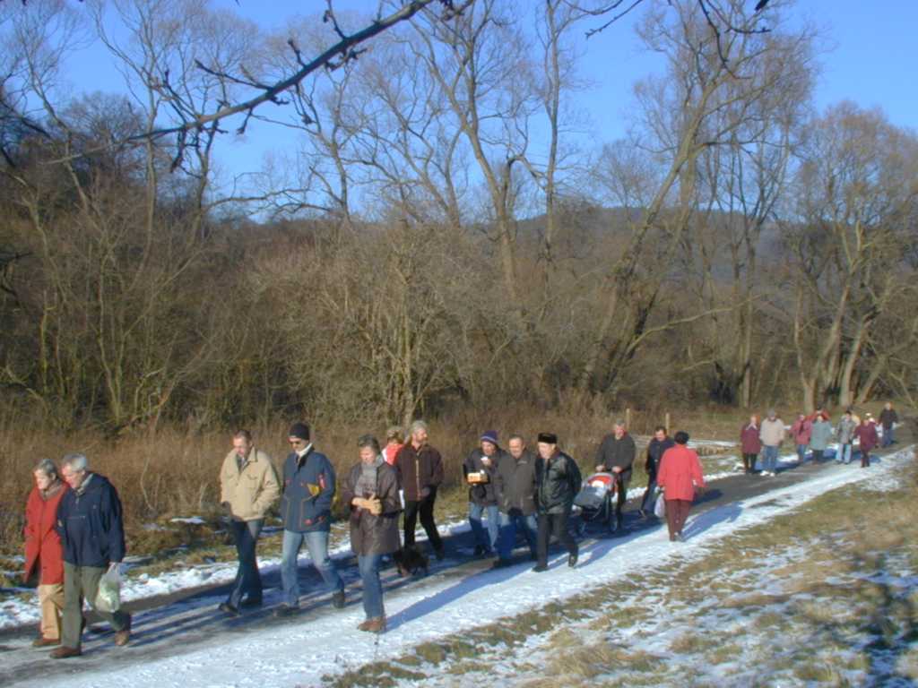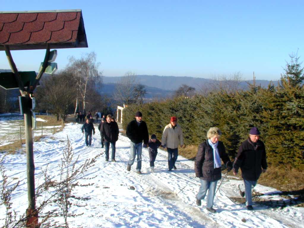 Am 14. Januar 2006 um 14.00 Uhr gab es zum Start der Winterwanderung einen kleinen Begrüßungsschluck. Bei schönstem Winterwetter ging es über das Gewerbegebiet nach Eichicht. Vorbei am Schloß wanderten wir Richtung Löhma. Am kleinen Lagerfeuer fanden sich ca. 50 Mitglieder und Gäste ein. Besonders erfreulich war, dass sich sogar über 80-jährige sehen ließen. Nach kurzer Zeit gab es vom Partyservice Krauße eine deftige Kartoffelsuppe mit Wiener Würstchen. Während sich die Erwachsenen mit Glühwein erwärmten, grillten die Kinder ihre Würstchen am Lagerfeuer. Viele kehrten auf dem Heimweg noch im Gasthaus „Zur grünen Eiche“ in Eichicht ein. An dieser Stelle ein herzliches Dankeschön für die Vorbereitung sowie an den Partyservice Krauße und die Fam. Ziener für die sehr gute Bewirtung.