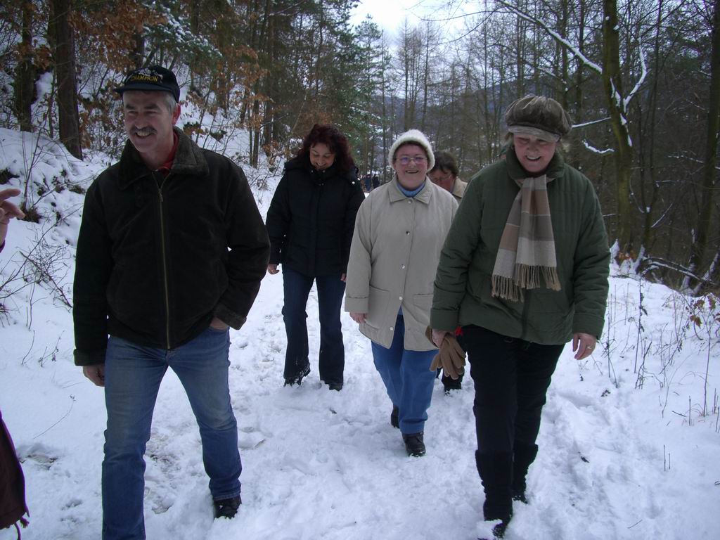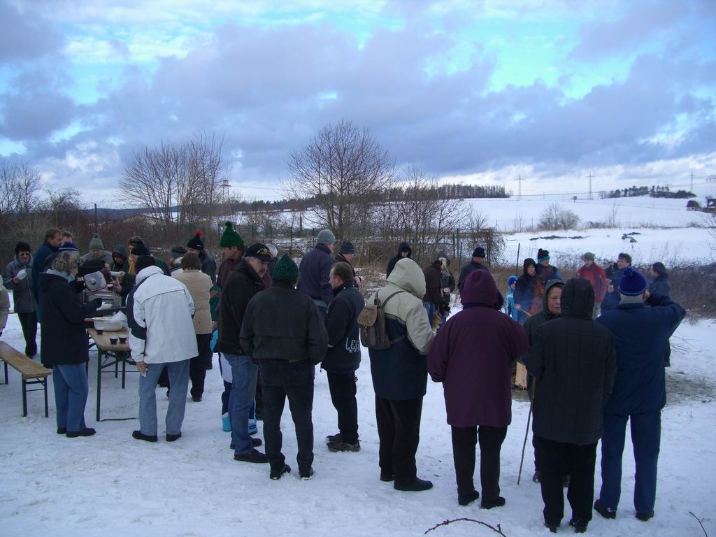 Das 1. Schneewochenende in diesem Winter veranlasste über 50 Vereinsmitglieder zur Wanderung auf den Roten Berg. Oberhalb der Rohrbahn wurden die Wanderer am Lagerfeuer bei frostigem Wind mit Glühwein verwöhnt. Der Party- und Pausenservice Krauße hatte außer Getränken Kesselgulasch und Kartoffelsuppe mit Wiener Würstchen angeliefert. Von unserer Beate gab es außerdem noch köstlichen Kartoffelsalat. Die Kinder konnten sich vor dem Schneemannbau Würstchen am Lagerfeuer grillen. Da der Schnee nicht pappte war es schwierig, Schneemänner zu bauen. Alle Kinder wurden zu Siegern erklärt und werden mit einem Eisessen belohnt. Die Wanderung endete im Gasthaus „Zum weißen Roß“. Hier fand dann auch die Aufnahme von neuen Migliedern statt. An dieser Stelle ein herzliches Dankeschön an alle, die zum guten Gelingen der Winterwanderung beigetragen haben.