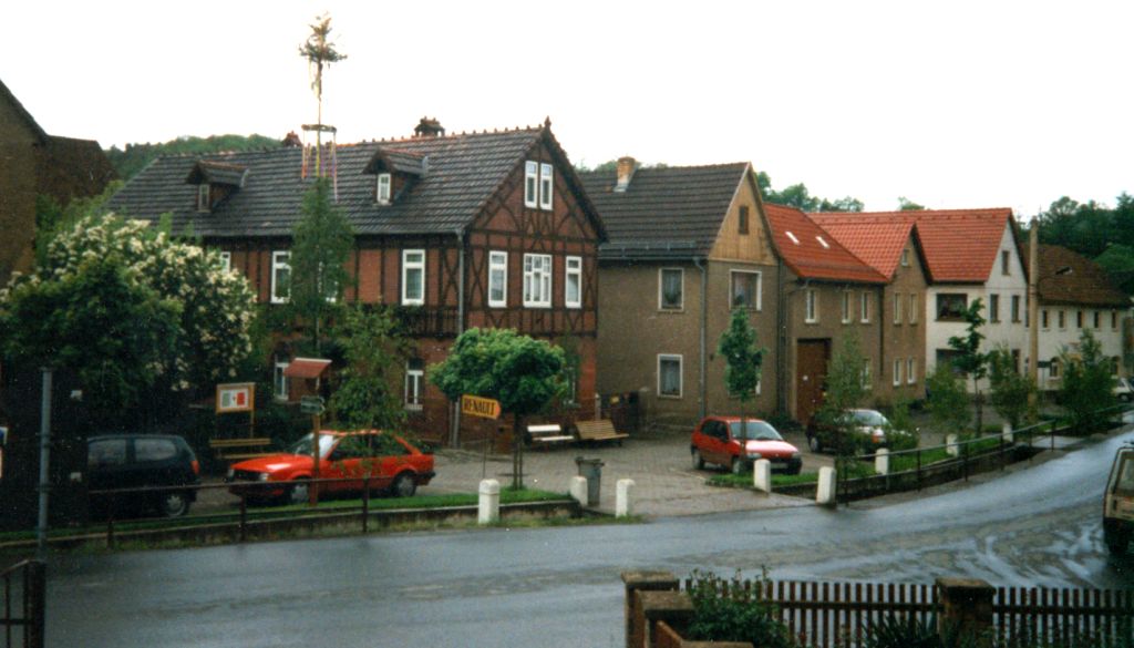 Aber noch mal zurück zur Kriegszeit. Während des zweiten Weltkrieges waren im Saal des Gasthofes Rosenthal (da wo an der Gänsemarktseite die große eiserne Treppe angebracht war) französische Kriegsgefangene, die tagsüber bei den Bauern arbeiten mussten, untergebracht. Im unteren Gasthof (Triebel) hat man 1944/45 im Saal und in einem Nebengebäude für die am Rüstungsbau in der Wutsche eingesetzten Fremdarbeiter (Polen und Ukrainer) das Essen bereitet und ausgegeben. Es gäbe wohl sicher noch manches über den Gänsemarkt zu schreiben. Eines muss aber noch betont werden. Als Gänsemarkt wurde nur die linke Bachseite zwischen dem obern und unterem Gasthof bezeichnet. Die andere Seite an der Straße zwischen Edelhof und der Saale gehörte nicht dazu und wurde Hauptstraße oder Saalstraße, später Saalfelder Straße genannt. Die Straßennamen spielten früher sowieso keine so überragende Rolle, da die Hausnummern mindestens bis in die sechziger Jahre durch das ganze Dorf fortlaufend waren.